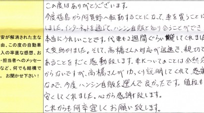 初めての車購入に不安や疑問は多くありましたが、電話での相談で無理のない適切な予定をあわせてくださったりしたことや、車購入への不安や疑問の解消は、たすかりました。